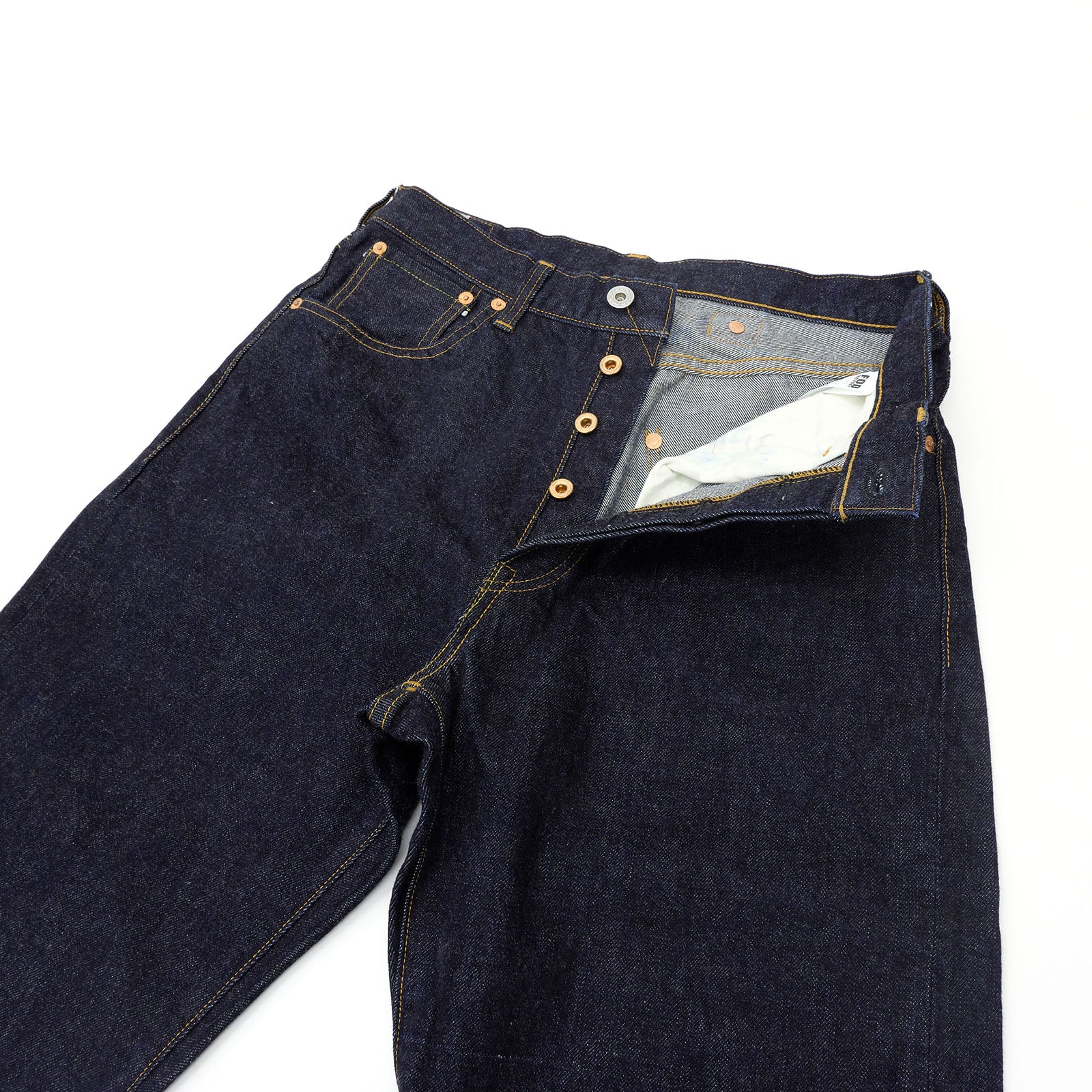 Jeans cinq poches au style workwear avec une martingale sur l'arrière. Confectionné dans une toile de denim japonais 14,75 oz, un tissu original à base de coton Supima. Ce tissu est réputé pour son vieillissement exceptionnel. La silhouette présente une taille légèrement haute et est légèrement ample au niveau des hanches et des cuisses. Le pantalon présente une silhouette naturellement fuselée vers l'ourlet, créant une silhouette qui n'est pas trop ample. Le pantalon est orné de rivets cuivre écrasés et d'une étiquette en cuir de cerf.