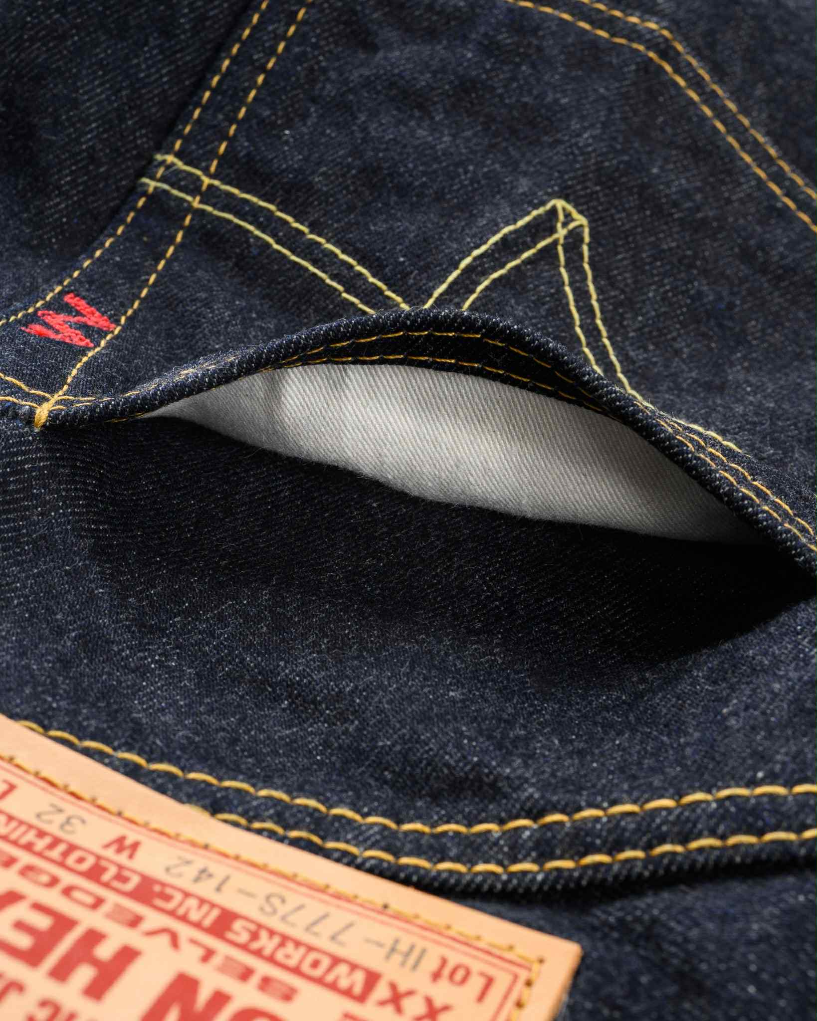 Jeans coupe slim fuselée confectionné dans un toile de denim Selvedge 14oz qui est fabriqué avec un fil de trame double retors (la même technique de construction que le denim selvedge 21oz). C'est le denim japonais "le moins lourd" de la marque.